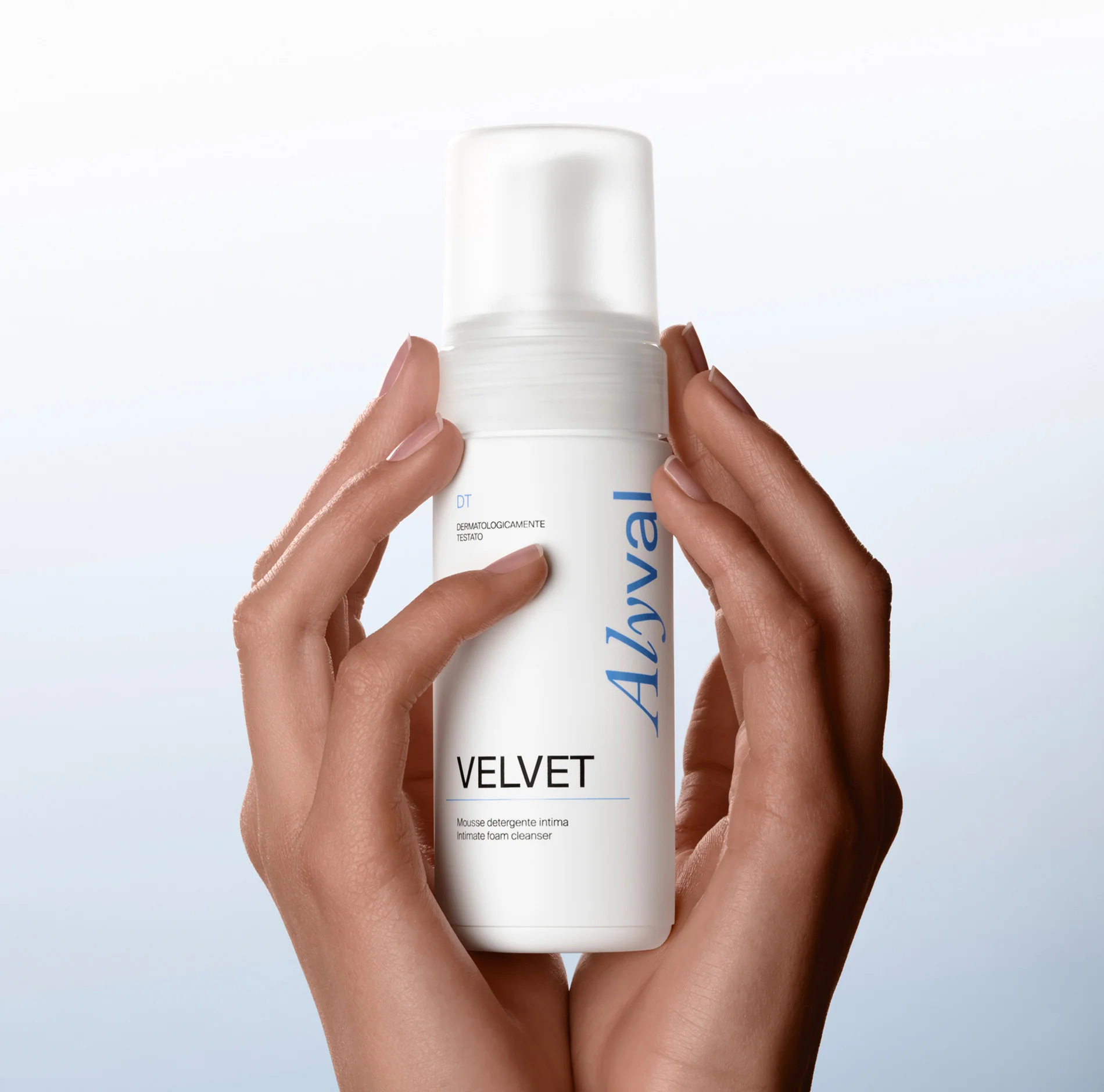 Alyval Velvet Intimate Foam Cleanser is a dermatologically tested mousse formulated for daily intimate hygiene. With its soft, creamy foam, it gently cleanses the delicate area while respecting the skin’s natural pH and providing long-lasting freshness, hydration, and comfort.